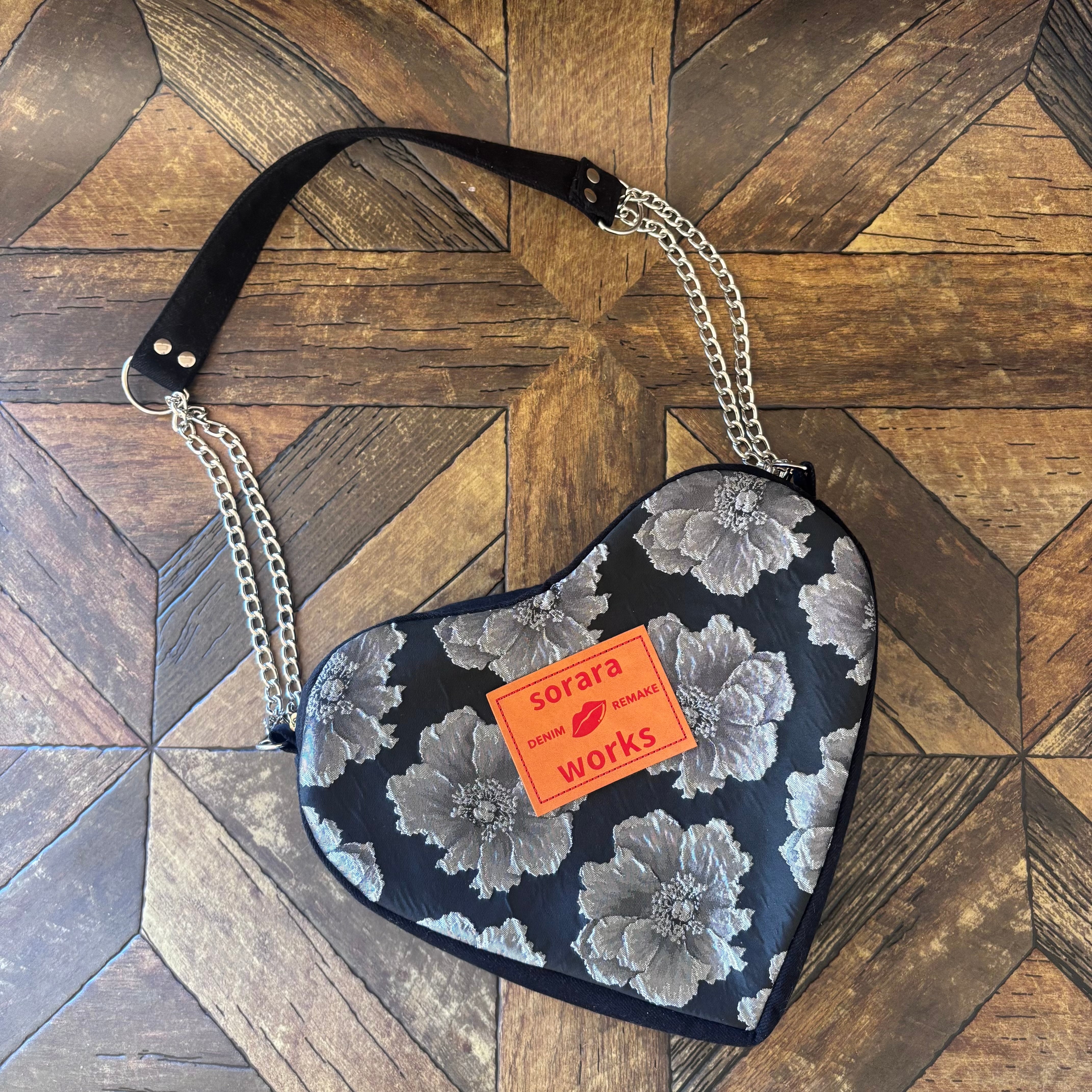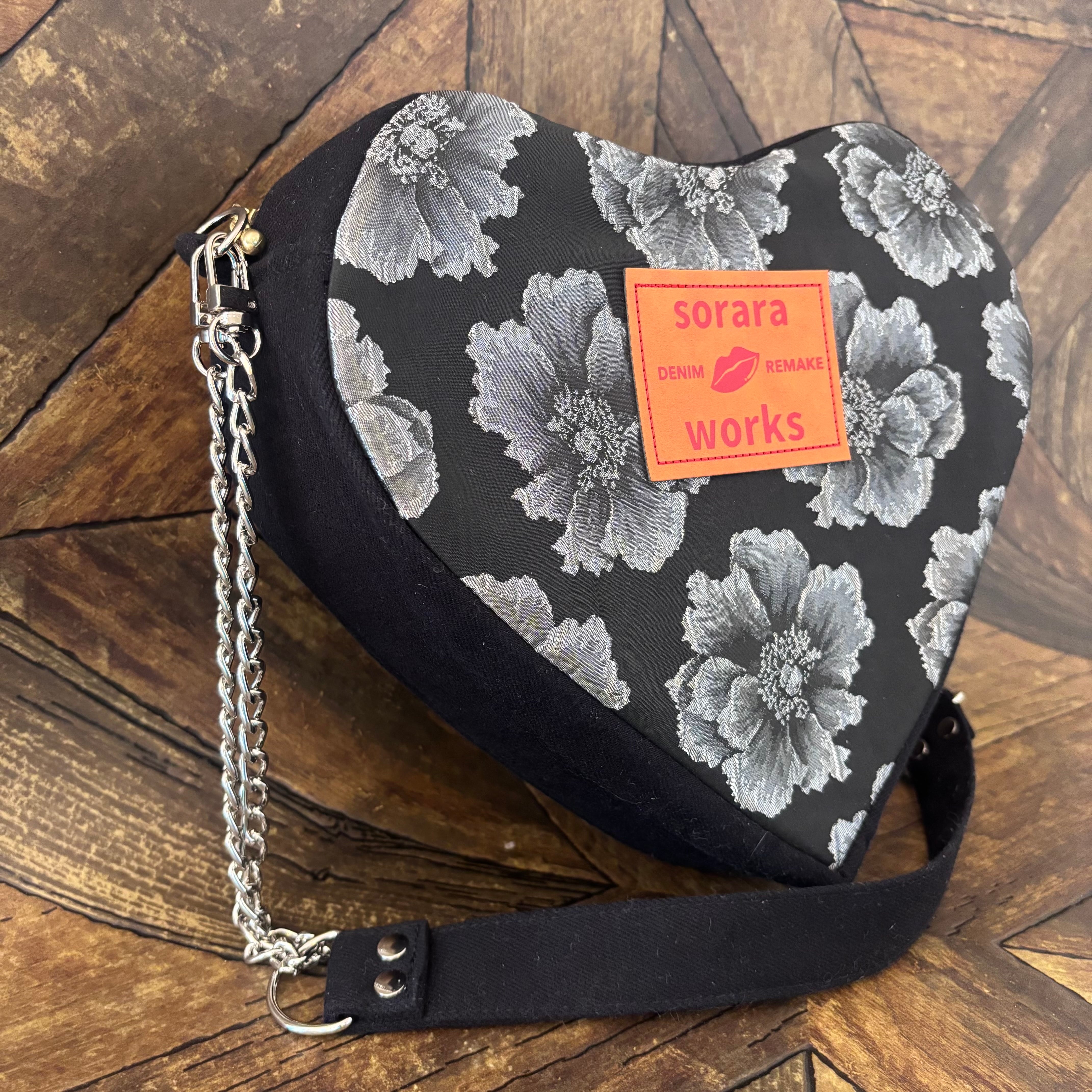 デニムリメイク 花柄 ハートバッグ